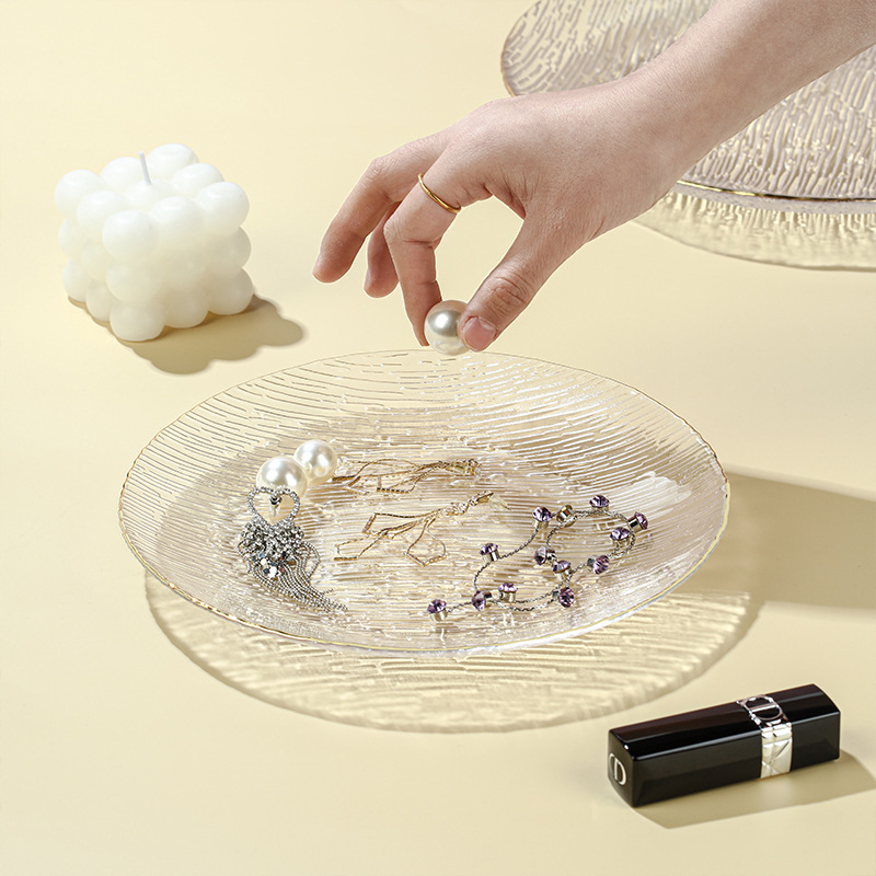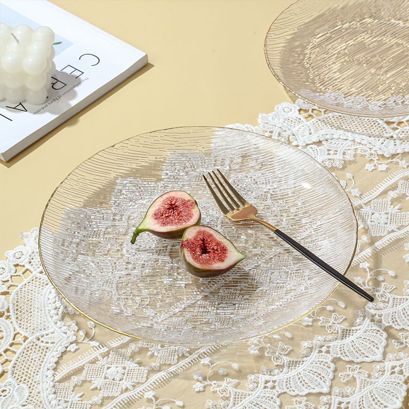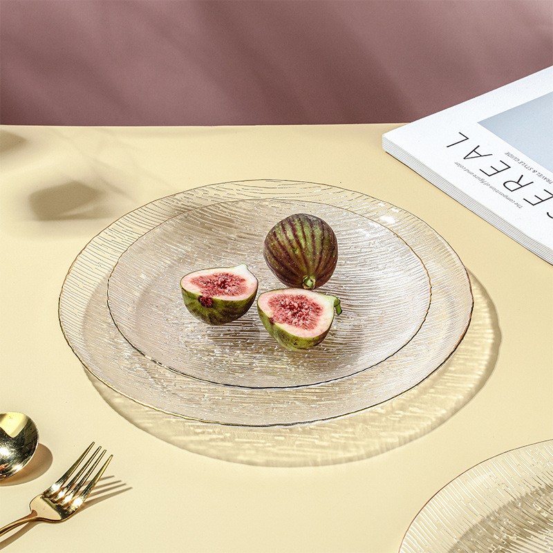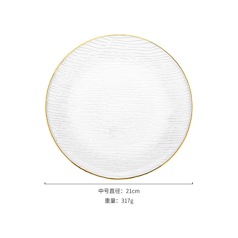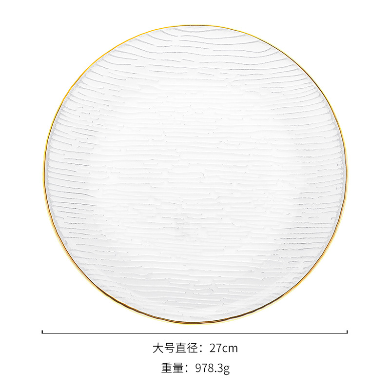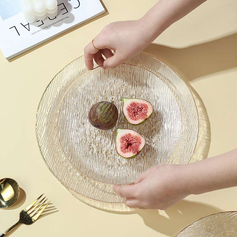 Стаклен сад за овошје со златен обод е направен од високоборосиликатен материјал, кој е без олово и без кадмиум. Тоа е безбедно и практично. Направен е од материјали кои се во контакт со храната и е здрав и безбеден. Устата на плочата има позлатен раб, кој е модерен и грациозен во облините; внатрешниот ѕид е мазен, а надворешниот ѕид е врежан со водени линии, што му дава чувство на трнлив на допир и нелизгачко триење; комбинацијата на трнливата текстура и проѕирното тело создава блескава визуелна гозба, со подвижна светлина и сенка.